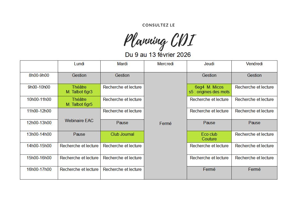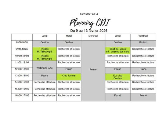Planning du 9 au 13 février 2026